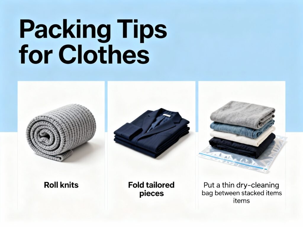 Roll knits, fold tailored pieces, and put a thin dry-cleaning bag between stacked items.