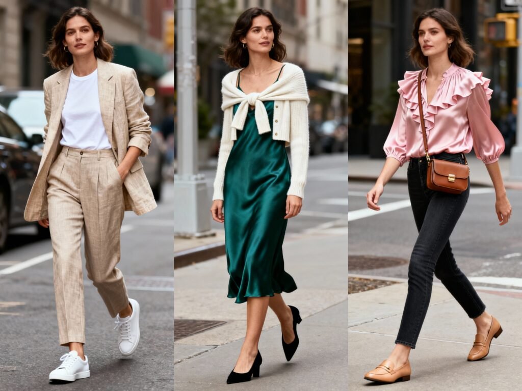A leather loafer and a low block heel cover 95% of situations. They look intentional with trousers, dresses, and denim. FYI, pointed or almond toes elevate everything.