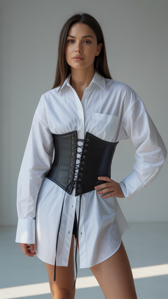 - A corset belt or bustier layered over the shirt.