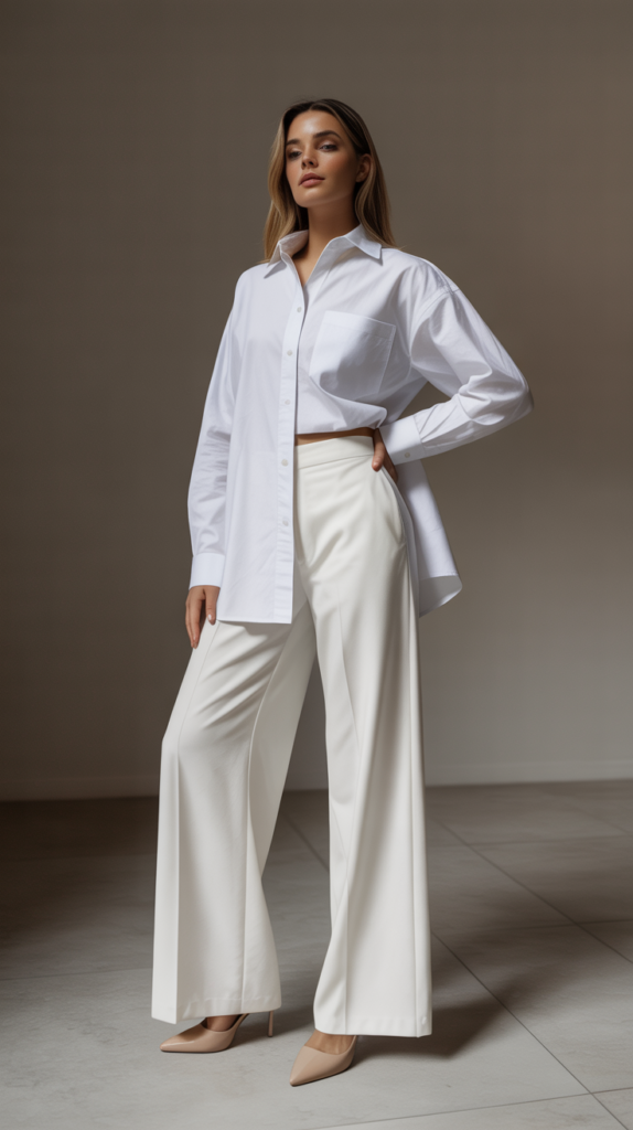 - White oversized shirt + white wide-leg pants + nude heels = chef’s kiss.