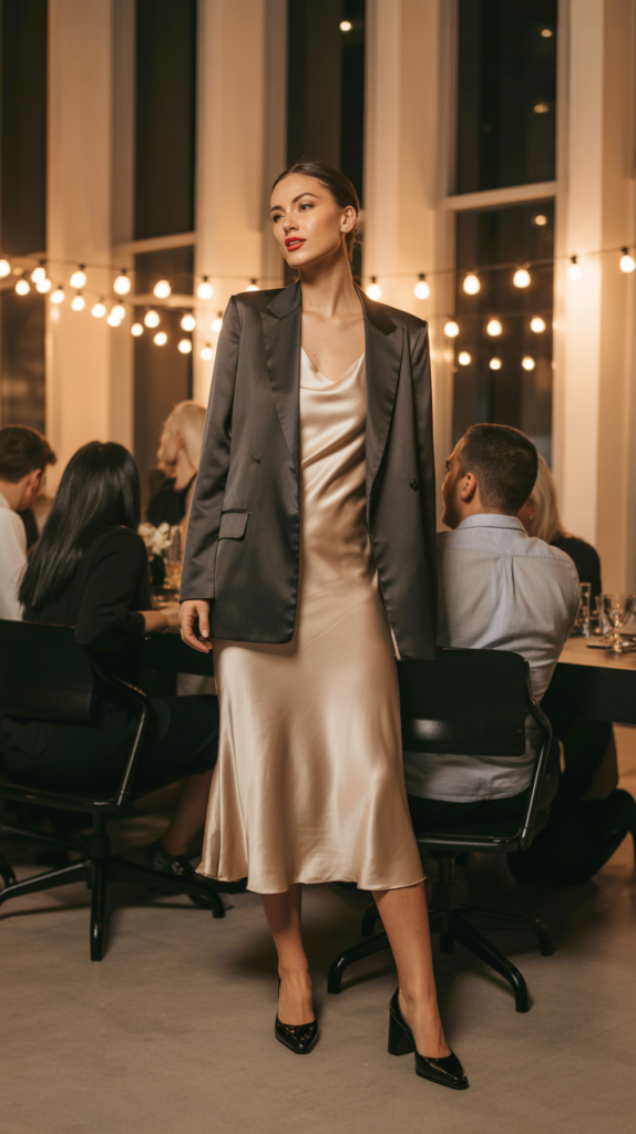 - Blazer: A structured blazer over a slip or sheath adds instant polish. Try a satin lapel for subtle party energy.