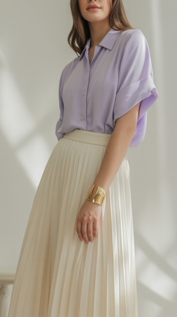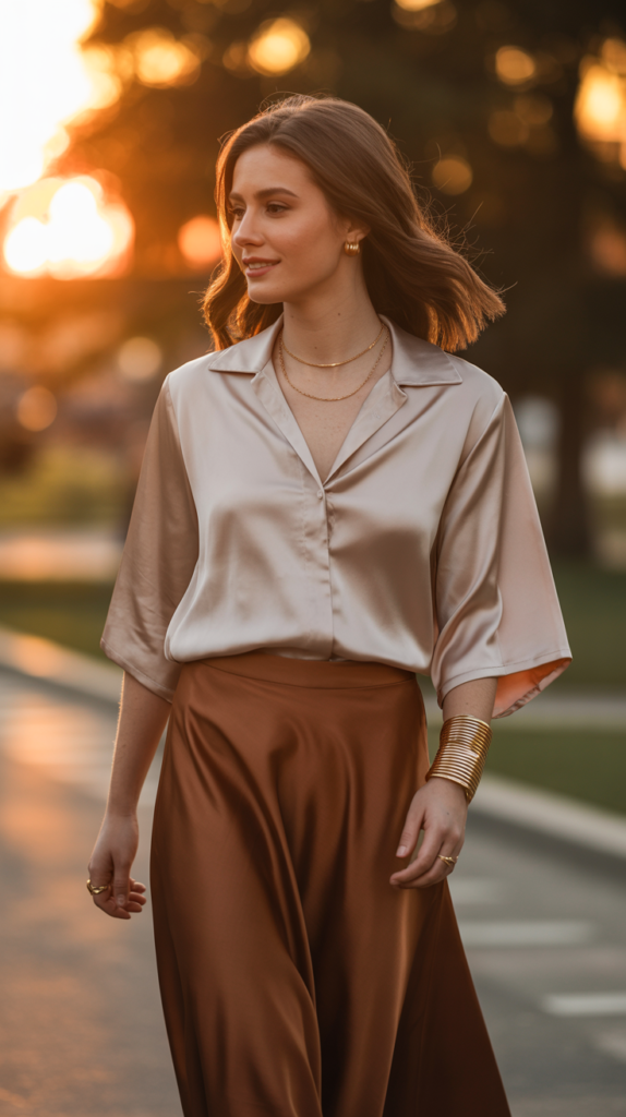 Ever tried this combo at sunset? The light hits differently. Trust me — that golden hour reflection on a silk sleeve with a gold cuff is chef’s kiss.