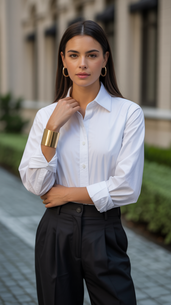 ✨ 1. Gold Cuff + Crisp White Shirt = Instant Authority