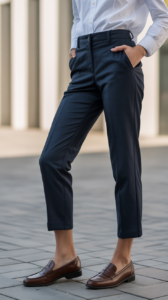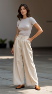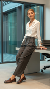 Want to look like you walked off a fashion editorial? Wide-leg trousers with loafers scream chic without trying too hard. The loafers ground the outfit and add structure.