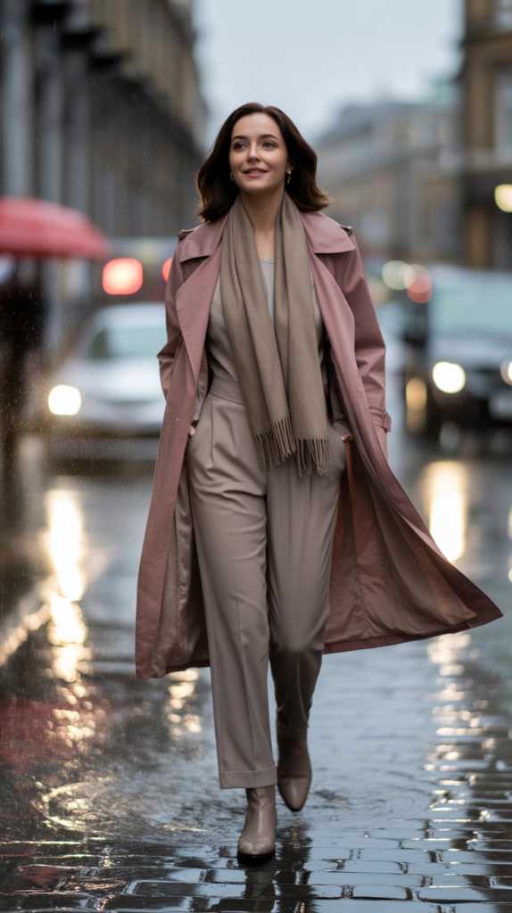 - Dusty rose trench + monochrome neutrals: Think oatmeal, stone, or taupe.
