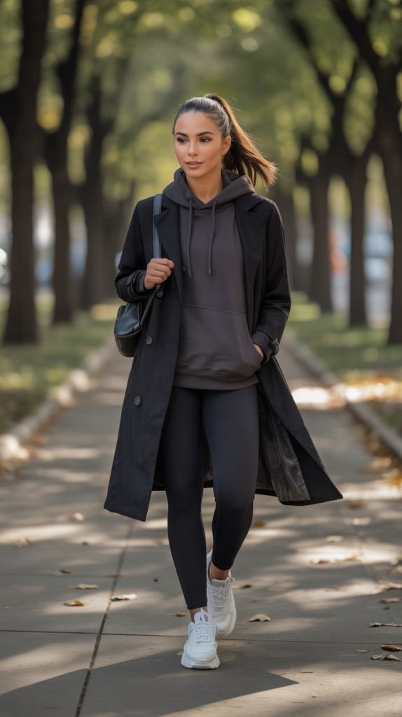 - Black trench + gray hoodie + leggings + chunky trainers + mini backpack. High ponytail optional, attitude included.