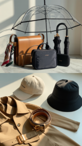 - Umbrellas: Compact, sturdy, and preferably not a flimsy supermarket special. A transparent dome umbrella looks chic and keeps hair intact.
