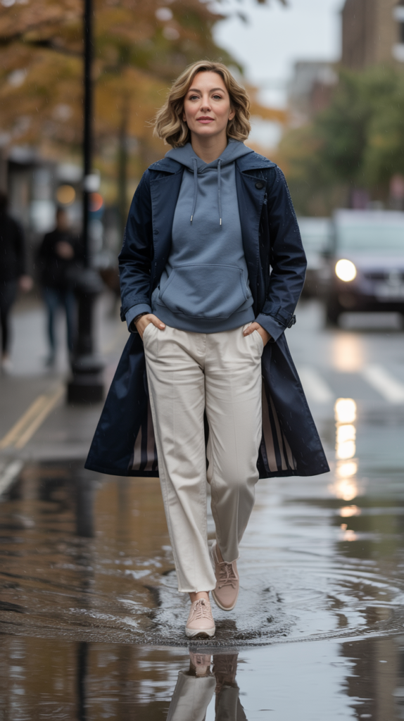 - Navy trench + gray hoodie + cream trousers: Effortlessly cool, coffee-run approved.