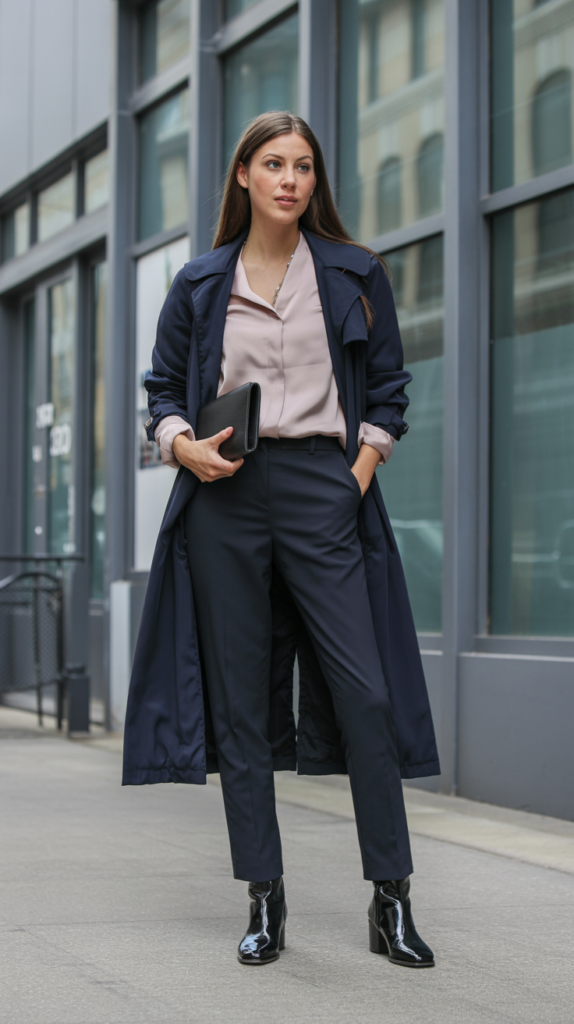 - Navy trench + silk blouse + tailored black trousers + block-heel boots + structured crossbody.