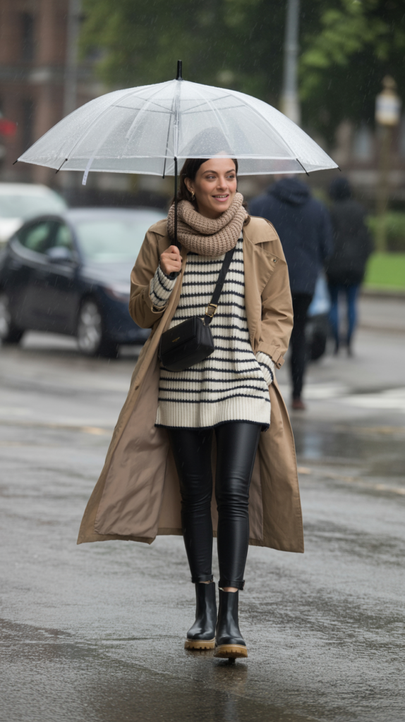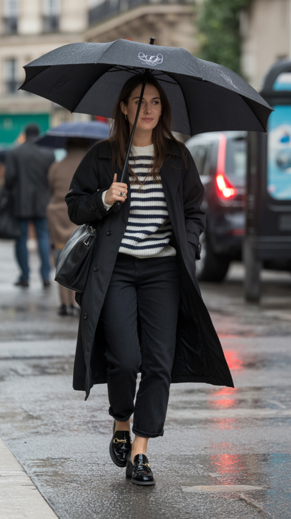 - Black trench + striped knit + patent loafers: Parisian, even if you’re just running errands.