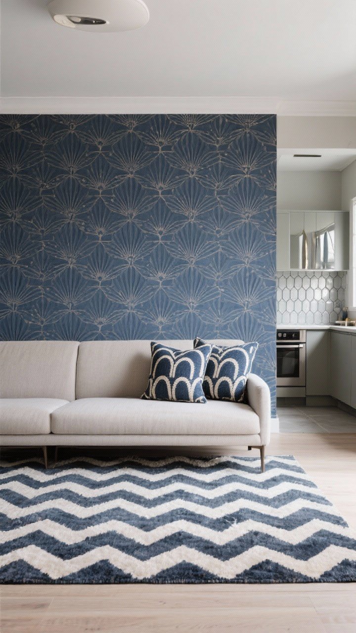 - Rugs: Low-contrast chevrons or concentric arcs that add movement without shouting.