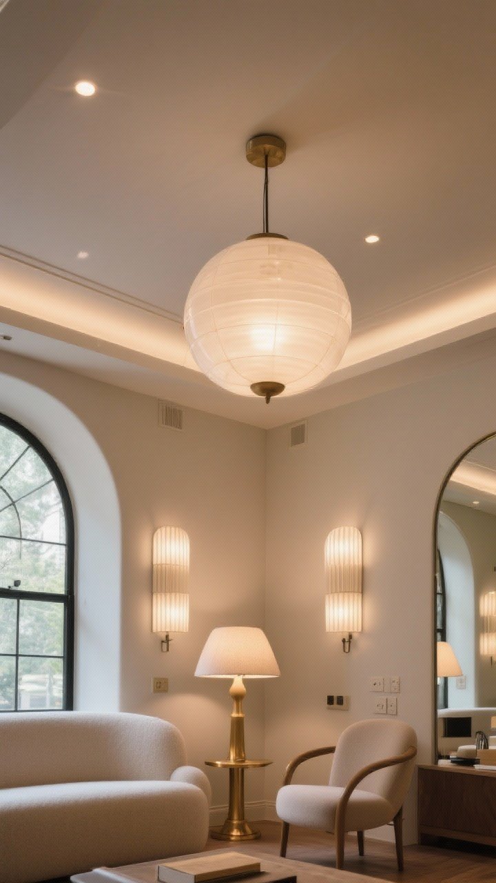 - Centerpiece: A globe chandelier, tiered discs, or linear pendant with soft opal glass.