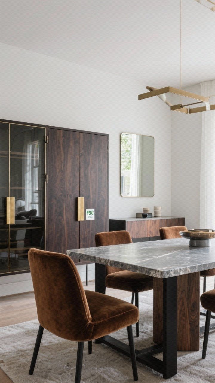 - Tables & casegoods: Walnut, ebonized oak, lacquer, and stone or stone-look composite.