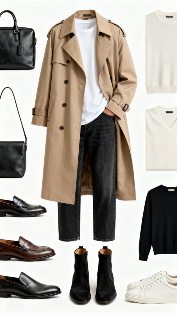 - Shoes: loafers, ankle boots, sleek sneakers in leather or suede