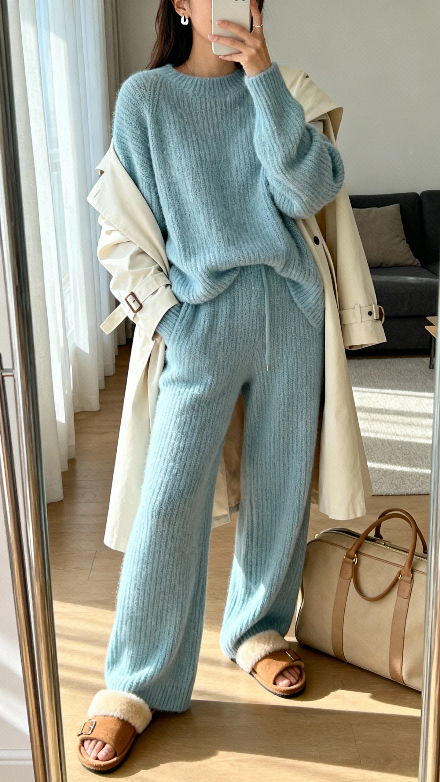 Meet your chic comfort uniform: an icy blue knit set with wide-leg pants and a relaxed sweater. It’s effortlessly put-together, perfect for travel, WFH, or casual dinners. Add structured accessories and it instantly looks intentional, not loungey.