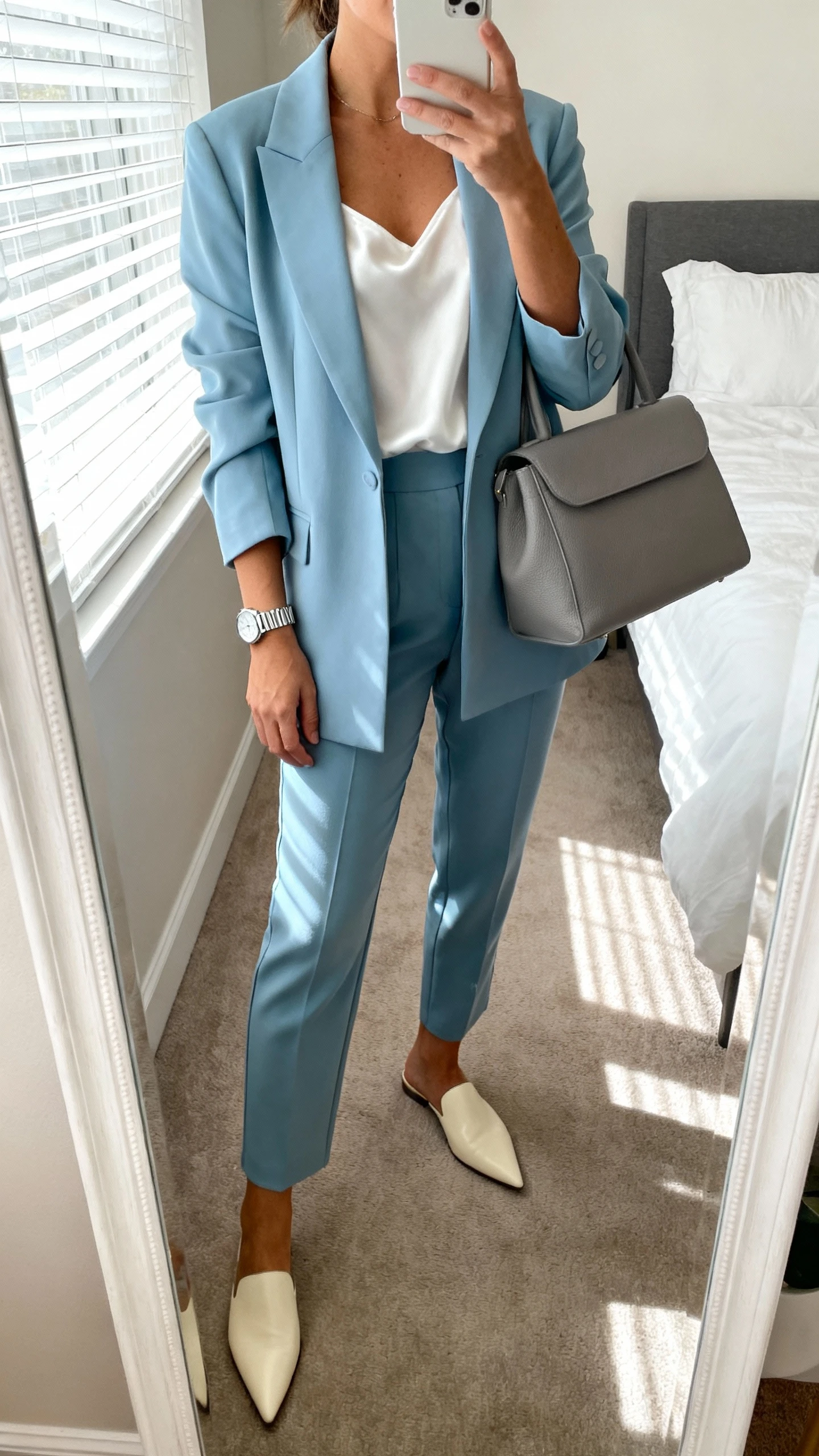 - Low-contrast accessories: icy blue shines when the rest is soft. Skip harsh black and try cream, tan, or soft metallics.