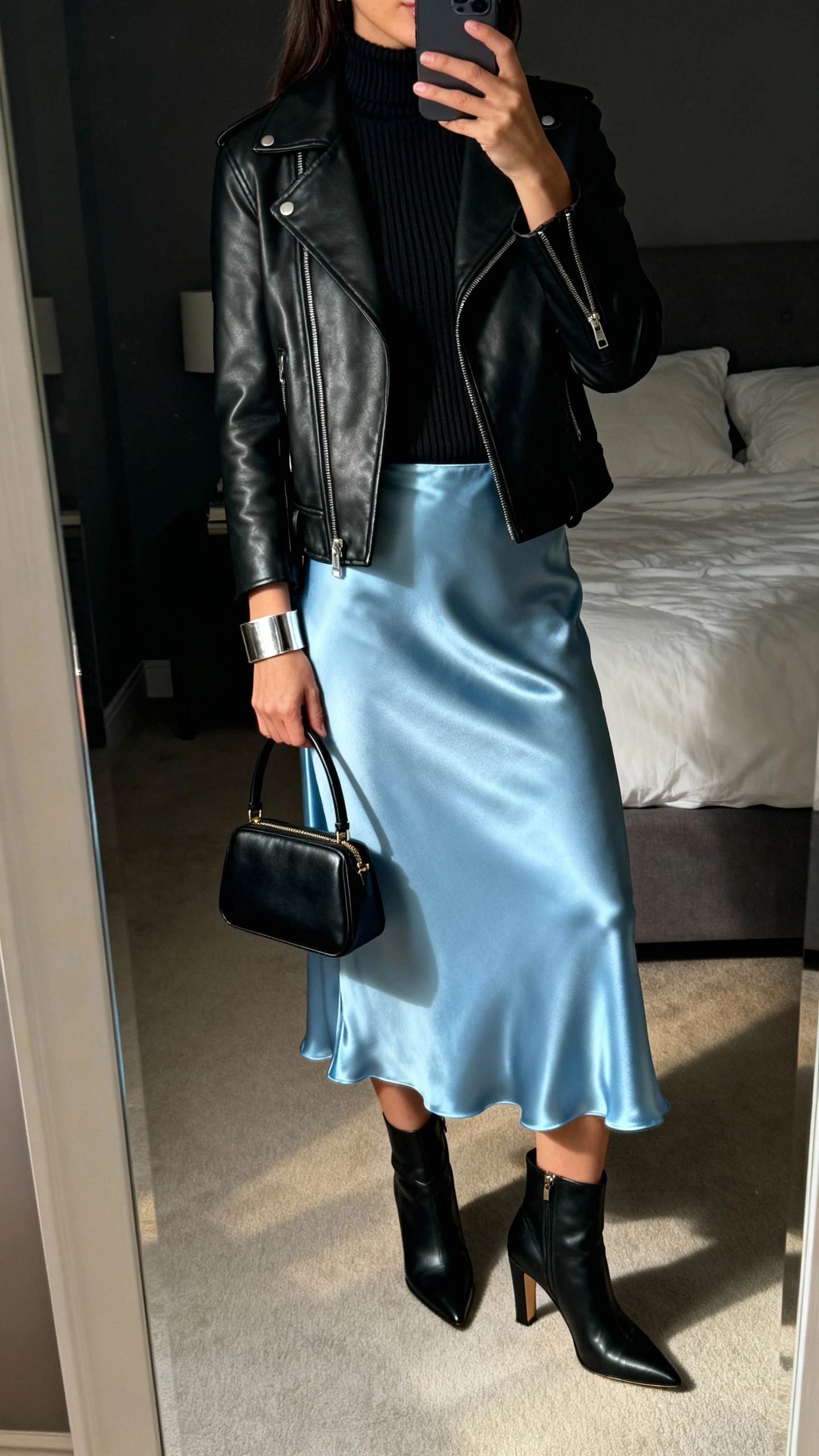When you want something flirty-but-cool, reach for an icy blue satin slip skirt paired with a black leather jacket and minimal heels. The contrast—soft shine against tough leather—feels high-fashion without the effort. It works for date night, rooftop drinks, or anywhere with twinkle lights.