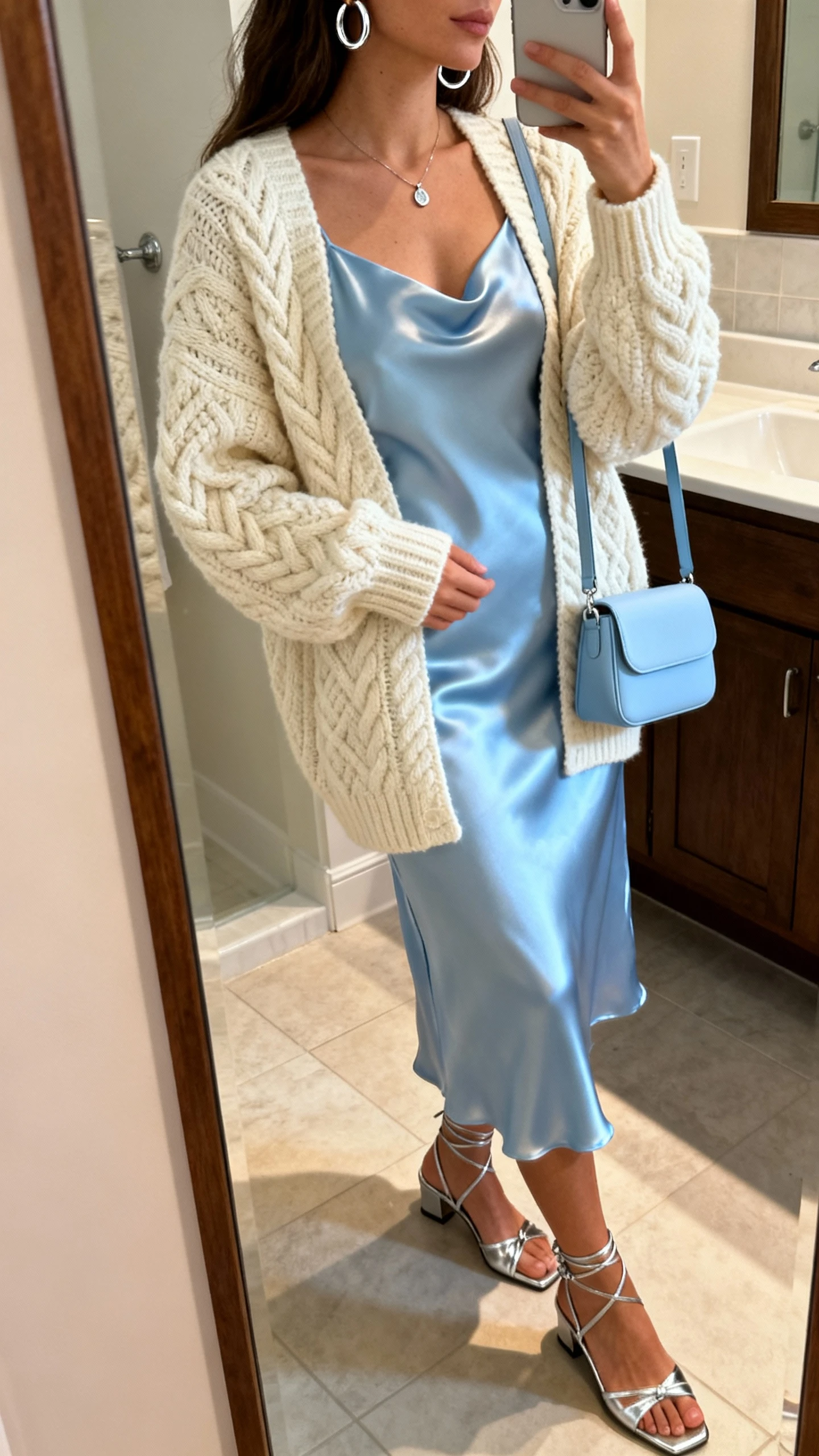 If you want to glow in candid brunch pics, this is it. A silky icy blue slip dress layered with a chunky cream sweater hits that sweet spot between effort and ease. It’s romantic, minimal, and surprisingly warm. Add a little sparkle and you’re set.