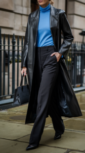 Look for clean cuts: cinched waist, structured shoulders, or bold lapels. A fitted trench or belted wool coat gives polish without fuss.