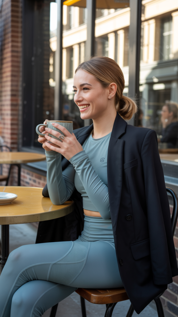 - Post-gym coffee date? Throw on an oversized blazer over your set. Boom, street-style ready.