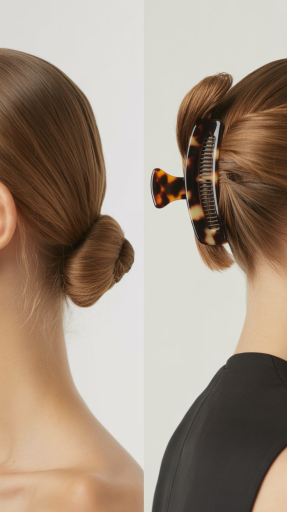 - A sleek claw clip or low bun → looks polished instantly.