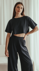 Because yes, you do need to pretend you didn’t just roll out of bed. Even simple accessories like a silk scrunchie, minimal earrings, and sleek slippers elevate the whole set.