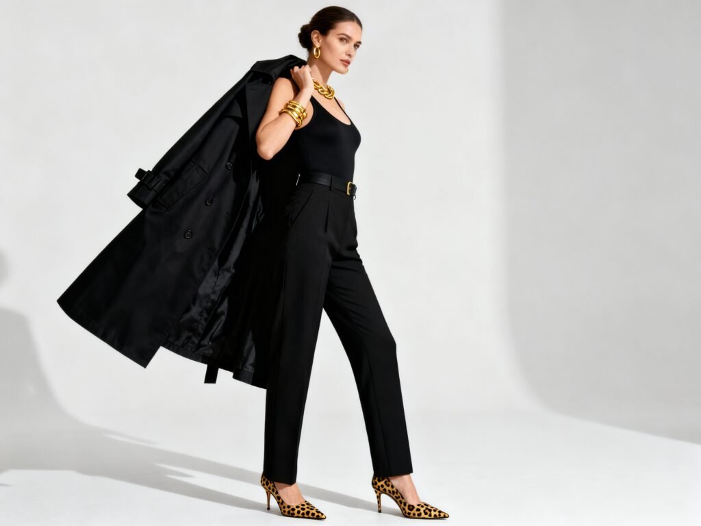 - All-black: Sharp blazer, fitted knit, tapered trousers, pointed pumps. Cold-blooded and chic.