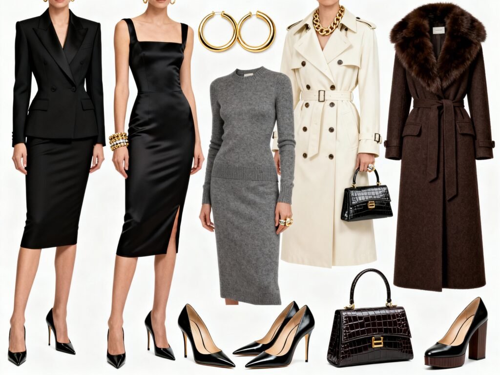 Think clean lines, sharp tailoring, ultra-feminine silhouettes, and accessories that look expensive and slightly intimidating. The formula? Structure + sensuality + luxury. No one piece screams; the whole look purrs.
