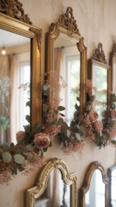 - Antique gold mirrors + pine garland = traditional elegance.
