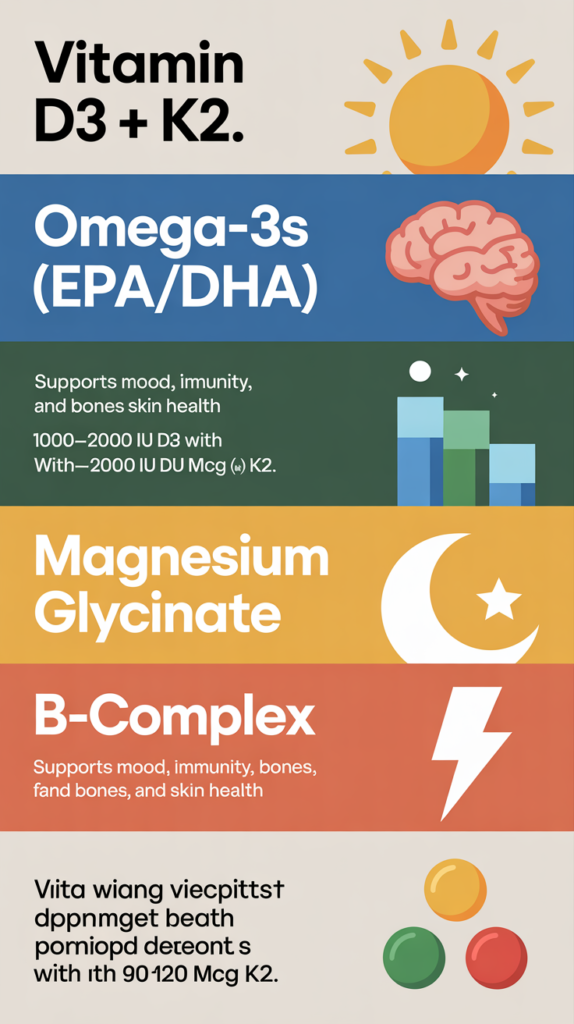 - Essentials: D3/K2 combo, omega-3, magnesium glycinate, B12 or B-complex.
