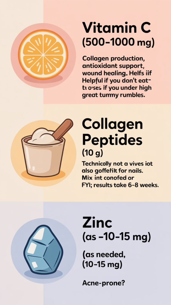 - Nice-to-haves: Vitamin C, collagen, zinc.