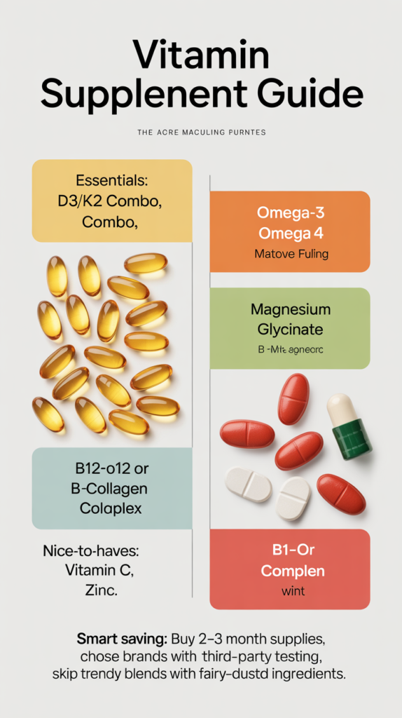 - Smart saving: Buy 2–3 month supplies, choose brands with third-party testing, skip trendy blends with fairy-dusted ingredients.