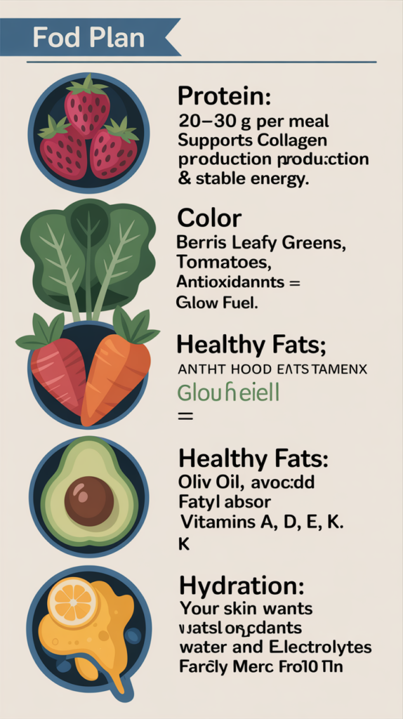 - Protein: 20–30 g per meal supports collagen production and stable energy.