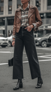 Outfit: Slim plaid flannel shirt tucked into high-waist wide-leg black denim, topped with a cropped leather jacket.