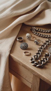 Vintage rings and brooches: A curated mix says you didn’t just Google this look—you lived it.