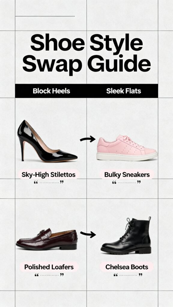 - Block heels or sleek flats instead of sky-high stilettos.
