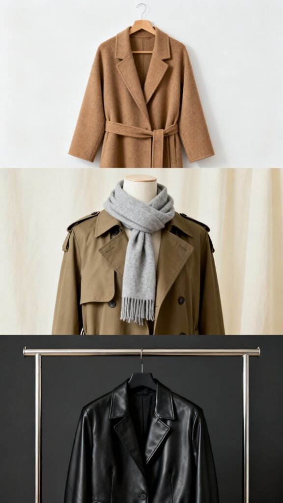 - Wool overcoat or tailored wrap coat.