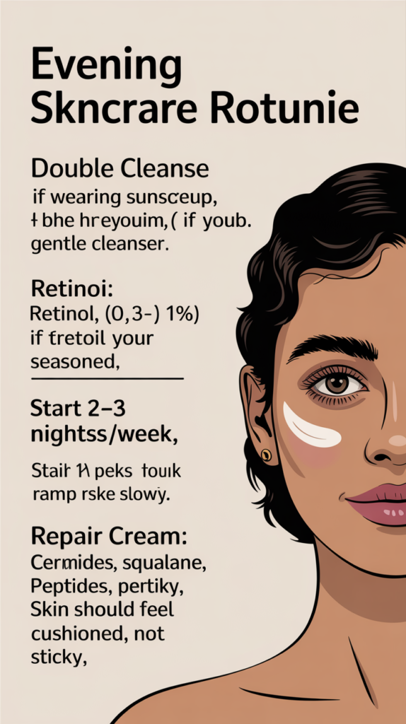 - Repair cream: Ceramides, squalane, peptides. Skin should feel cushioned, not sticky.