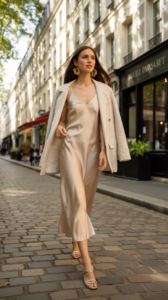 A midi silk slip skims the body, not the sidewalk. Add a slightly oversized black blazer and barely-there heels. Keep jewelry delicate.