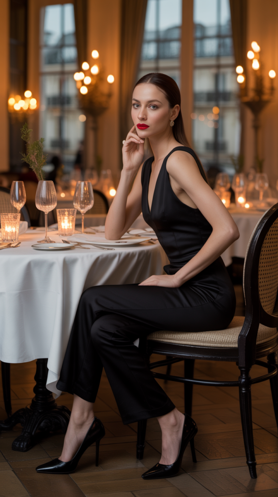 Sometimes it’s a black knit set or a minimalist jumpsuit. The key? Clean lines and good tailoring.