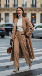 Tailored trousers, cashmere turtleneck, long wool coat. Leather gloves and heeled ankle boots. A bold lip keeps the look alive beneath layers.