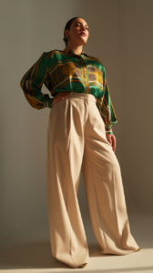 • Wide-Leg Trousers + Statement Blouse: High-waisted wide-leg pants are flattering and elongate the legs. Add a blouse with puff sleeves or a satin finish, and you’re set.