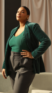 • Velvet Blazer + Tailored Pants: Velvet is so festive it basically screams “holiday party!” Pair a rich jewel-toned blazer with sleek pants, and you’re ready for anything from cocktail parties to family dinners.