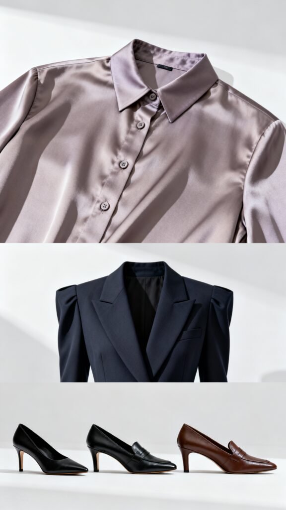 - Mid-heel slingbacks or loafers with a slim silhouette
