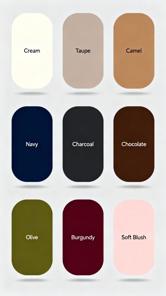 - Neutrals: Cream, taupe, camel, navy, charcoal, chocolate.