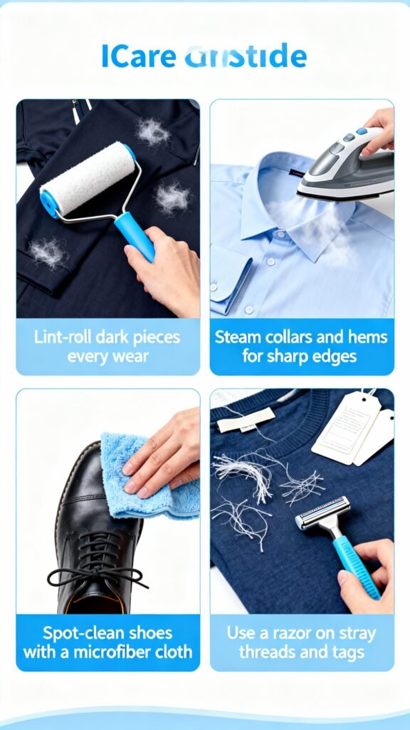 - Lint-roll dark pieces every wear.