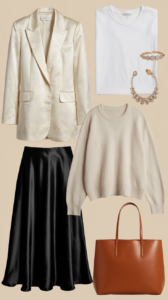 2. Week 2: Add a tan cashmere-feel sweater + satin skirt.