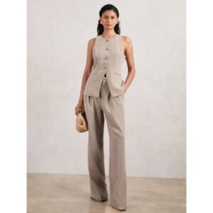 Opt for straight-leg or wide-leg in beige, cream, or charcoal.