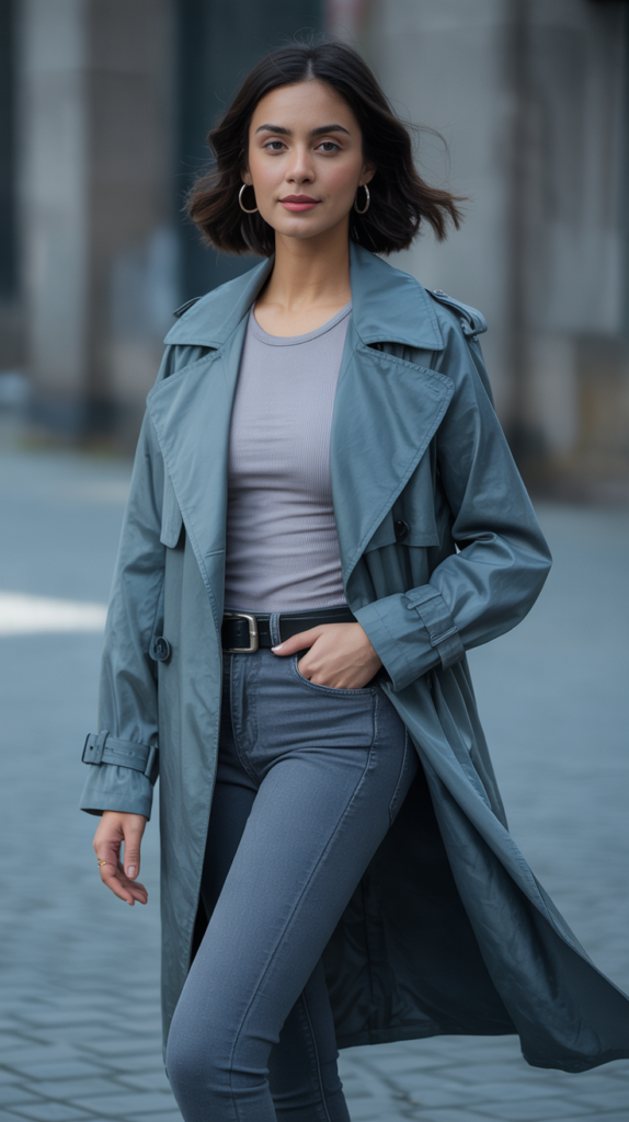 Pick a color family (charcoal, forest, chocolate) and layer different textures so it doesn’t read flat. Imagine a slate gray raincoat, graphite denim, gunmetal belt, and silver hoops. It’s giving main character energy, even in drizzle.