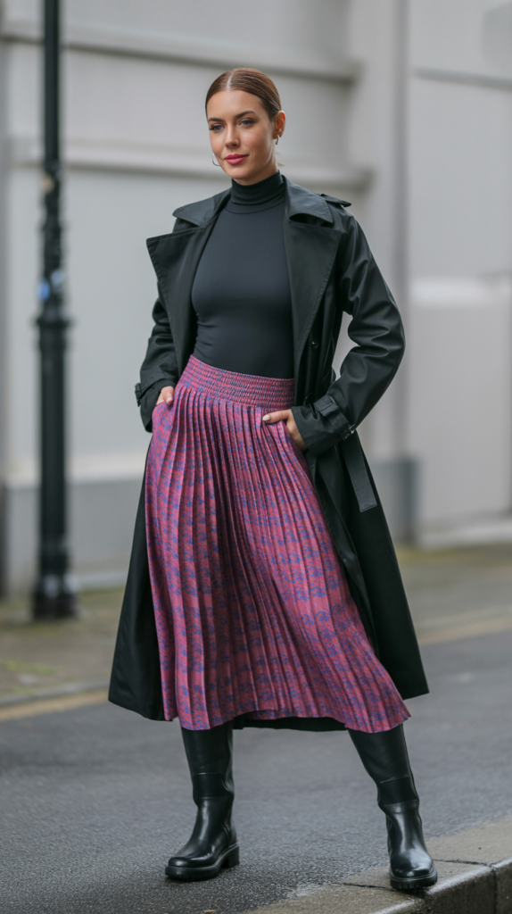 Choose pinstripes, micro-checks, or abstract florals in muted tones. A printed midi skirt with a rain shell feels unexpected and chic, especially with a stacked-heel ankle boot.